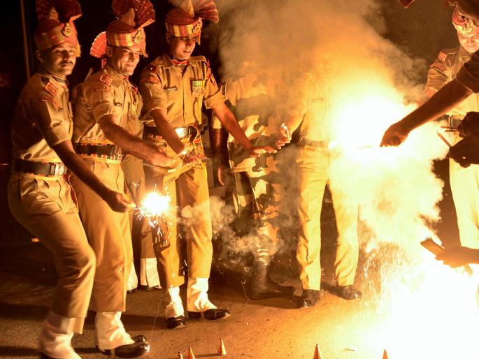 1 / 4बीएसएफच्या जवानांनी परगवालच्या आंतरराष्ट्रीय सीमारेषेवर दिवाळी साजरी केली. 2 / 4बुधवारी संध्याकाळी जवानांनी सीमारेषेवर मेणबत्त्या प्रज्वलित केल्या. तसंच फटाकेही उडविले.3 / 4सीमेवर लढणाऱ्या या जवानांनी सीमारेषेजवळ रांगोळीही काढली होती.4 / 4एकमेकांना मिठाई आणि भेटवस्तू देत जवानांनी दिवाळी साजरी केली.