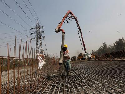 नवी दिल्लीत पुलाच्या उभारणीचं काम करताना एक कामगार.