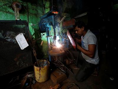 कोलकात्यात वेल्डिंगच्या कामात गढून गेलेला कामगार.