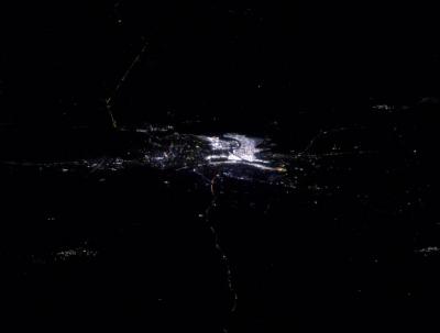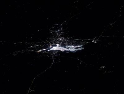 पेटिट यांनी काढलेल्या फोटोमध्ये, प्रयागराजचे संगम शहर चकमकत असलेले दिसत आहे.