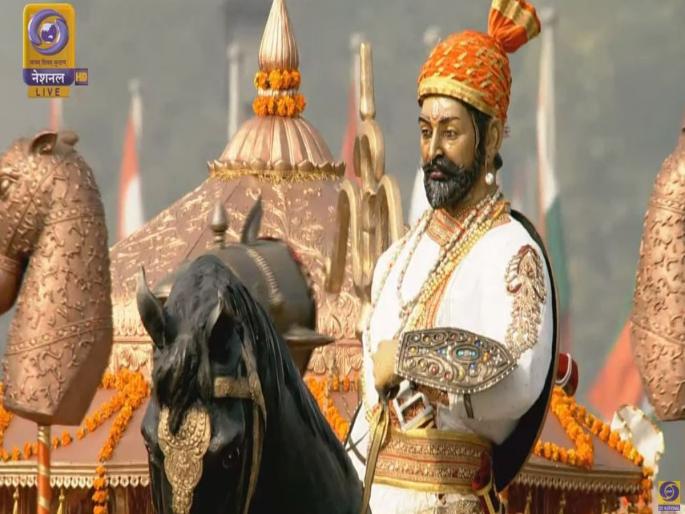 1 / 4प्रजासत्ताक दिनाच्या परेडसाठी राजपथावर छत्रपती शिवाजी महाराजांचा राज्यभिषेक सोहळा पाहायला मिळाला. 2 / 4ज्या दिल्लीने छत्रपतींच्या स्वराज्याला कायम कमी लेखलं, ज्या दिल्लीश्वरांशी झगडण्यात शिवरायांचं आयुष्य खर्ची पडलं त्याच दिल्लीच्या मातीत अनेक राष्ट्रप्रमुखांच्या उपस्थितीत छत्रपतींच्या पराक्रमाची कीर्ती सांगणारा हा चित्ररथ दिमाखात अवतरला.3 / 4चित्ररथाच्या सुरुवातीला किल्ल्याची प्रतिकृती होती त्यावर मधोमध शिवरायांची अश्वारुढ प्रतिकृती दर्शवण्यात आलेली आहे.4 / 4 या चित्ररथाची संकल्पना ज्येष्ठ कलादिग्दर्शक नितीन देसाई यांनी सादर केली आहे.