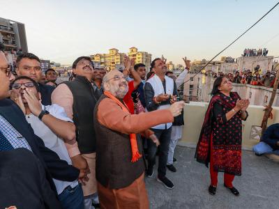 अमित शहा यांना देखील पतंग उडविण्याचा मोह आवरता आला नाही आणि त्यांनी देखील पतंग उडवली.