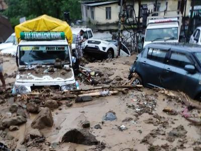 मंडी शहरातील जेल रोड, झोनल रुग्णालय आणि सैन मोहल्ला या भागात बुधवारी पहाटे ३ वाजता ढगफुटी होऊन प्रचंड पाऊस झाला. अनेक घरे-दुकानांमध्ये पाणी भरले गेले.