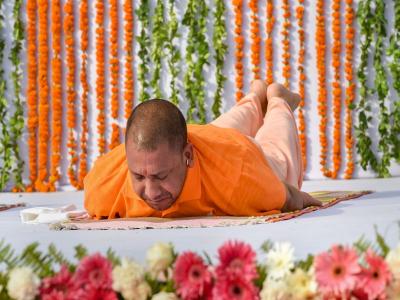 उत्तरप्रदेशचे मुख्यमंत्री योगी आदित्यनाथ यांनी लखनऊ येथील राजभवन परिसरात आयोजित योग शिबिरात योगासने केली.