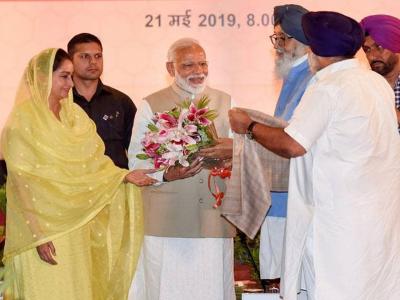 एनडीएच्या मेजवानीमध्ये नरेंद्र मोदींचा सत्कार करताना अकाली दलाचे प्रमुख प्रकाशसिंह बादल आणि कुटुंबीय