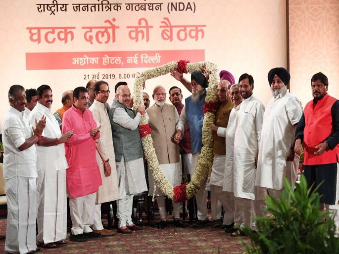 1 / 8एक्झिट पोलमध्ये वर्तवण्यात आलेल्या कलांमुळे भाजपात उत्साहाचे वातावरण आहे. त्याच पार्श्वभूमीवर भाजपाध्यक्ष अमित शहा यांनी मंगळवारी राष्ट्रीय लोकशाही आघाडीमधील मित्रपक्षांच्या नेत्यांना मेजवानीसाठी निमंत्रित केले होते. या मेजवानीमध्ये एनडीएचे बहुतांश घटक पक्ष सहभागी झाले होते. 2 / 8शिवसेना पक्षप्रमुख उद्धव ठाकरे यांनी लंडनहून मायदेशी परतल्यानंतर थेट दिल्ली गाठली आणि मेजवानीला उपस्थिती लावली. यावेळी उद्धव ठाकरे यांनी मोदींकडे महाराष्ट्रातील दुष्काळाचा प्रश्न उपस्थित केला.3 / 8लोकसभा निवडणुकीच्या निकालांपूर्वी बोलवलेल्या या डीनरला बिहारचे मुख्यमंत्री नितीश कुमार हे सुद्धा उपस्थित होते.4 / 8मेघालयचे मुख्यमंत्री कोनराड संगमा हे सुद्धा एनडीएच्या बैठकीस उपस्थित होते. 5 / 8नरेंद्र मोदींचा सत्कार करताना अण्णा द्रमुक पक्षाचे नेते6 / 8एनडीएच्या मेजवानीमध्ये नरेंद्र मोदींचा सत्कार करताना अकाली दलाचे प्रमुख प्रकाशसिंह बादल आणि कुटुंबीय7 / 8एनडीएतील मित्रपक्षांसोबतच्या बैठकीपूर्वी मोदींनी आपल्या मंत्रिमंडळातील सहकाऱ्यांशी चर्चा केली. यावेळी पाच वर्षांच्या कामाचा आढावा घेण्यात आला. तसेच पुढील पाच वर्षांसाठी रणनीती ठरवण्यात आली. आता गुरुवारी एनडीएच्या बाजूने मतदारांचा कौल लागल्यास मंत्रिमंडळात काही नव्या सदस्यांचा समावेश होण्याची शक्यता आहे. त्यांच्यासमोर 2022 चे लक्ष्य असेल. 8 / 82022 मध्ये देशाचा 75 वा स्वातंत्र्य दिन साजरा होणार असून, त्यावेळी देशातील जनतेला गरिबीपासून स्वातंत्र्य मिळावे, तसेच अन्न, वस्र, निवारा यांचा कुठेही अभाव असता कामा नये, अशी मोदींची इच्छा आहे. त्यासाठीच त्यांनी मिशन 2022 आखले आहे.