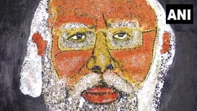 पंतप्रधान नरेंद्र मोदींच्या खांद्यावर भारत देशाचा भार सोपविण्यात आल्याचे चित्रातून दिसत आहे. वेगवेगळ्या रंगाच्या डाळींचा वापर हे चित्र बनिण्यासाठी करण्यात आला आहे.
