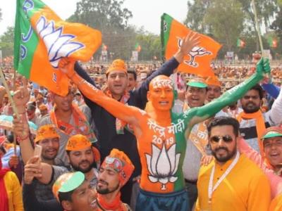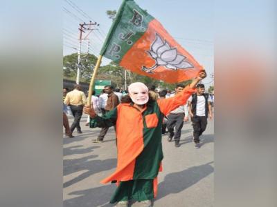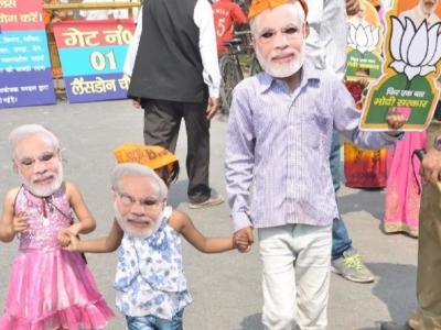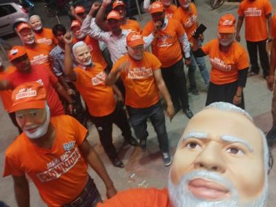 काही सभांमध्ये पंतप्रधान नरेंद्र मोदींचा मुखवटा परिधान करुन भाजपाचा झेंडाही फडकवताना एक समर्थक दिसत आहे.