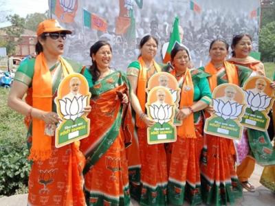 कमळाच फूल आणि फुलाची साडी परिधान करुन भाजपा समर्थक महिलांनी फोटोशूट केलं. हातात मोदींचा फोटो आहे हे विशेष