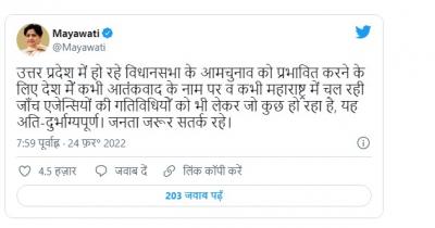 जनतेनं अवश्य सतर्क राहावे, असे मायावती यांनी ट्विट करु म्हटलं आहे. मायावती यांच्या ट्विटचा रोख पूर्णपणे नवाब मलिक यांच्यावर झालेल्या कारवाईसंदर्भातच होता.