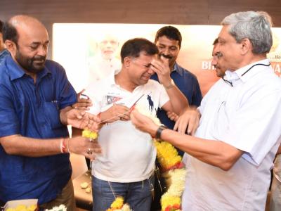 भाजप कार्यालयाबाहेर समर्थकांसमवेत मुख्यमंत्री मनोहर पर्रीकर. (छाया- गणेश शेटकर)