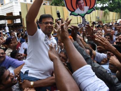 विश्वजित राणे यांचा जल्लोष करताना वाळपईचे भाजप कार्यकर्ते़. (छाया- गणेश शेटकर)