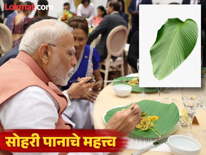 1 / 7भारतापासून हजारो किमी अंतरावर असलेल्या त्रिनिदाद व टोबॅगोमध्ये पंतप्रधान नरेंद्र मोदी पोहोचले. भेटी-गाठी, बैठका झाल्यानंतर त्यांच्यासाठी खास मेजवाणी ठेवण्यात आली होती. यात खास बाब म्हणजे त्यांना जेवण वाढलं गेलं ते सोहरीच्या पानावर.2 / 7सोहरीच्या पानावर वाढलेलं जेवण बघून मोदींना आनंद झाला. त्यांनी फोटो शेअर करत भावना व्यक्त केल्या. 'बघा आपली भारतीय संस्कृती किती दूरपर्यंत विस्तारली गेली आहे', असे पंतप्रधान मोदी म्हणाले.3 / 7त्रिनिदाद आणि टोबॅगोमध्ये अनेक वर्षांपू्र्वी भारतीय नागरिक रोजगाराच्या शोधात गेले. जाताना त्यांच्यासोबत भारतीय संस्कृती, परंपराही तिथे गेल्या. तिथे त्यांनी या पंरपरा जपल्या. त्यात सोहरीच्या पानावर जेवण करणंही त्यांनी जपलं.4 / 7भारतातही सोहरीच्या पानावर जेवण करण्याची पद्धती आहे. दक्षिण भारतात, पूर्व भारतातही अनेक ठिकाणी सोहरीची पाने जेवणासाठी वापरली जातात. या पानातील काही घटक जेवणात मिसळतात आणि जेवण स्वादिष्ट लागते असेही म्हणतात. 5 / 7सोहरीच्या पानावर जेवण करण्याचे फायदेही आहेत. गरम गरम जेवण जेव्हा या पानावर वाढलं जातं, तेव्हा या पानातून विशिष्ट प्रकारचा सुगंध निघतो, तो जेवणात मिसळला जातो आणि जेवण आणखी चविष्ठ बनतं.6 / 7या पानामध्ये अँटिऑक्सिडंटचे घटकही आहेत, जे शरीराची रोगप्रतिकारक शक्ती वाढवण्यास मदत करतात. या पानावर जेवण केल्यामुळे पचन प्रक्रिया सुधारते. जेवण पटकन पचते. त्यामुळे या पानावर घरी आणि वेगवेगळ्या समारंभात जेवण वाढले जाते. 7 / 7भारतात सोहरीच्या पानाबरोबरच काही भागांमध्ये केळीच्या पानाचाही वापर केला जातो. दक्षिण भारतात सोहरीच्या पानाचा वापर जास्त होतो, तर काही भागांमध्ये सोहरीची पान कमी उपलब्ध असल्याने तिथे केळीची पाने वापरली जातात.