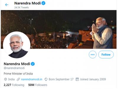 भारताचे पंतप्रधान नरेंद्र मोदी यांची सोशल मीडियावर लोकप्रियता दिवसेंदिवस वाढतच चालली आहे. ट्विटरवरील नरेंद्र मोदींच्या फॉलोअर्सची संख्या 50 मिलियन इतकी झाली. म्हणजेच 5 कोटींचा आकडा पार झाला आहे. ट्विटरवर सर्वाधिक जास्त फॉलोअर्स असलेल्या राजकीय नेत्यांच्या लिस्टमध्ये नरेंद्र मोदी तिसऱ्या स्थानकावर आहेत.