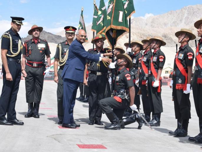 1 / 4रामनाथ कोविंद यांनी लेहचा दौरा केला. राष्ट्रपती पदाचा पदभार स्वीकारल्यानंतर रामनाथ कोविंद यांचा पहिलाच अधिकृत दौरा होता.2 / 4रामनाथ कोविंद यांनी लेहमध्ये तैनात असलेल्या लडाख स्काउटच्या सर्व रेजिमेंटसना भेट दिली. 3 / 4कारगिल युद्धात लडाख रेजिमेंटने दाखवलेल्या पराक्रमासाठी त्यांना पुरस्कार देऊन गौरव करण्यात आला.4 / 4राष्ट्रपती रामनाथ कोविंद यांच्या हस्ते लडाख स्काऊट्स रेजिमेंटल सेंटर आणि रेजिमेंटच्या बटालियन्सला ध्वज प्रदान करण्यात आला.