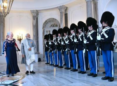 पंतप्रधान नरेंद्र मोदींनी आपल्या तीन दिवसीय युरोप दौऱ्यादरम्यान, मंगळवारी डेन्मार्कला भेट दिली. तेथे त्यांनी आपले समकक्ष असलेल्या पंतप्रधान मेटे फ्रेडरिक्सन यांची भेट घेऊन अनेक महत्त्वाच्या मुद्द्यांवर चर्चा केली. त्यानंतर मोदींनी कोपनहेगन येथे किंग्डम ऑफ डेन्मार्कच्या महाराणी मार्गारेट द्वितीय यांची भेट घेतली. यावेळी महाराणींनी पंतप्रधान नरेंद्र मोदींचं थाटात स्वागत केलं.