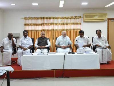ओखी वादळाचा फटका बसलेल्या नागरिकांच्या भेटीसाठी आलेल्या पंतप्रधान नरेंद्र मोदी यांचे स्वागत करताना तामिळनाडूचे मुख्यमंत्री पलानीस्वामी आणि राज्यपाल बनवारीलाल पुरोहित.