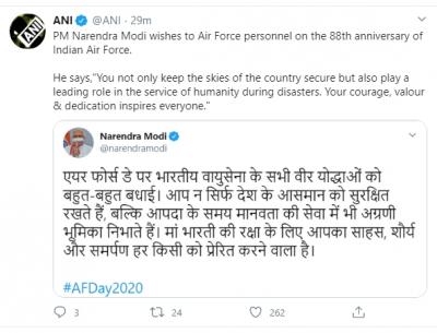 भारती हवाई दलाच्या वर्धापन दिनानिमित्ताने पंतप्रधान नरेंद्र मोदींनी ट्विटरच्या माध्यामातून हवाई दलाच्या जवानांचे अभिनंदन केले आहे. "हवाई दलाच्या दिनानिमित्त भारतीय हवाई दलाच्या सर्व शूर योद्ध्यांना शुभेच्छा!