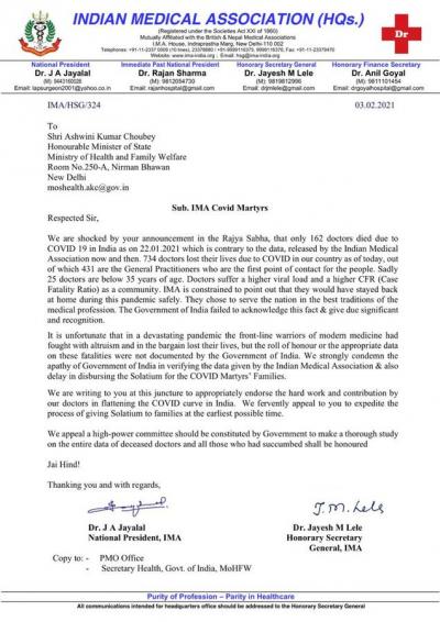 आयएमएने यासंदर्भात एक पत्र लिहिलं आहे. आकडेवारीबाबत नाराजी व्यक्त केली आहे. तसेच सरकारने याची उच्चस्तरीय चौकशी करावी अशी मागणी देखील केली आहे. एका हिंदी वेबसाईटने याबाबतचे वृत्त दिले आहे.
