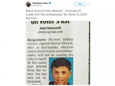 सर्वोच्च न्यायालयाचे वकिल ऋषिकेश यादव यांनी 14 एप्रिल रोजी राहुल द्रविडच्या मतदानासंदर्भातील छापलेली बातमी शेअर केली. तसेच दुर्दैवाने निवडणूक आयोगाने त्यांनाच ब्रँड अॅम्बेसिडर बनवले होते, असेही ट्विटमध्ये म्हटले.