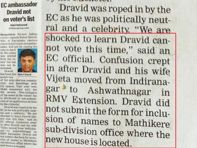 राहुल आणि त्यांच्या पत्नीचे नाव हटविल्यानंतर नवीन ठिकाणी नाव टाकण्यासाठी 6 नंबरचा फॉर्मही घेतला. पण, तो जमा केल्यामुळे राहुल यांचे नाव यादीत आलंच नाही. 2018च्या कर्नाटक विधानसभा निवडणुकी दरम्यान द्रविडने आपले घर बदलले आणि त्यामुळे त्याने इंदिरानगर मतदारसंघातून आपले नाव कमी केले. नवीन मतदारसंघात त्याला नाव नोंदवता आले नाही.