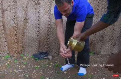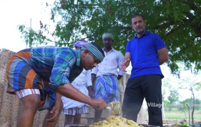 केळीच्या पानावर व्हिलेज कुकींग युट्यूब चॅनेलच्या टीमसोबत मस्त बिर्याणीही खाल्ली, यावेळी चवीचेही कौतुक केलं.