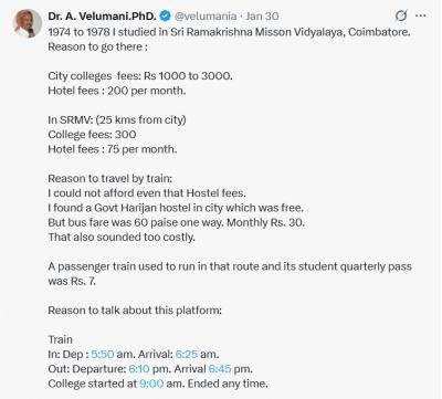 या पोस्टसोबत वेलुमणी यांचा एक फोटो देखील आहे, ज्यामध्ये ते रेल्वे प्लॅटफॉर्मवरील एका बाकावर बसले आहेत आणि त्यांच्यासोबत त्यांची पत्नीही आहे.