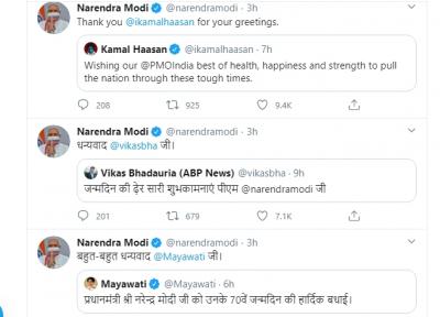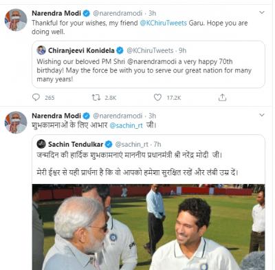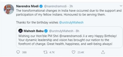 अभिनेता महेश बाबूनेही मोदींना पोलादी व्यक्तीमत्व असे संबोधत शुभेच्छा दिल्या आहेत, मोदींनीही महेश बाबूंचे आभार मानले आहेत.