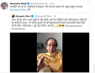 अभिनेता अनुपम खेर यांच्या मातोश्रींनीही व्हिडिओ बनवून मोदींना शुभेच्छा दिल्या आहेत.