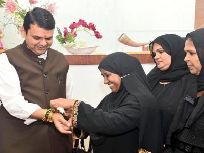 मुख्यमंत्री देवेंद्र फडणवीस यांनी वर्षा बंगल्यावर भाजपामधील मुस्लिम महिलांकडून राखी बांधून घेतली.