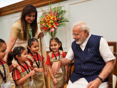 पंतप्रधान नरेंद्र मोदी यांनी शाळकरी मुलींसह रक्षाबंदन साजरा केला. चिमुकल्यांनी मोदींची भेट घेऊन त्यांना राखी बांधली.