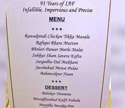 दरम्यान, भारतीय हवाई दल दिनाच्या डिनरसाठी जे मेन्यू कार्ड तयार करण्यात आलं. त्यामध्ये रावळपिंडी चिकन टिक्का मसाला, भोलारी परीन मेथी मलाई आणि बालाकोट तिरामिसू यासारख्या पदार्थांचा समावेश करण्यात आला होता. त्याशिवाय रफिकी रारा मटण, सुक्कूर शाम सवेरा कोफ्ता, मुझफ्फराबाद कुल्फी आणि बहावलपूर नान सारखे पदार्थ ठेवण्यात आले होते.