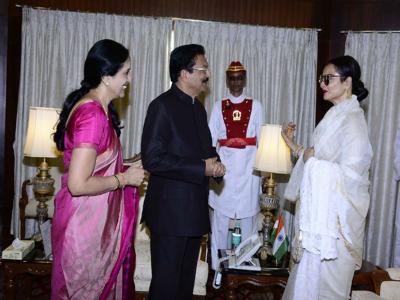 अभिनय सम्राज्ञी रेखा, सोमवारी राजभवनात आली होती. राज्यपाल सी. विद्यासागर राव आणि त्यांच्या पत्नी सी. विनोदा यांची राज्यसभा सदस्य या नात्याने त्यांनी सदिच्छा भेट घेऊन फोटोही काढले.