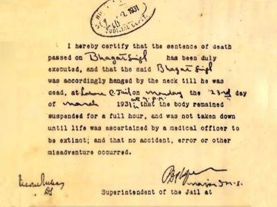 भगत सिंग यांच्या मृत्यूचा दाखला.
