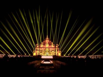 लेझर लाईटसमध्ये उजळलेले गांधीनगर येथील स्वामिनारायण अक्षरधाम मंदिर.