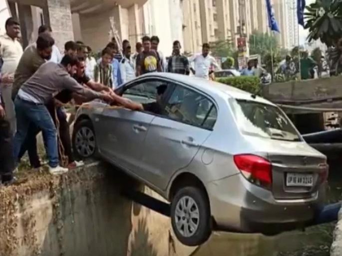 1 / 4नोएडामध्ये बिसरख परिसरात रविवारी एका कारला अपघात झाला. चालकाचे नियंत्रण सुटल्याने कार उघड्या नाल्यामध्ये पडता पडता थांबली. केबलच्या पाईपवर जवळपास कार 35 मिनिटे लटकून राहिली. यानंतरचा थरार कॅमेरामध्ये कैद झाला आहे. 2 / 4ही कार होंडाची अमेझ होती. पाईपावर लटकल्याने यातील चालक वाचला खरा पण त्याला बाहेर काढण्यासाठीही लोकांना खूप प्रयत्न करावे लागले. नाहीतर जराजरी तोल ढळला असता तर कारसह चालक वाहत्या नाल्यामध्ये पडला असता. 3 / 4नाल्यामध्ये लटकलेली कार पाहून लोकांनी गर्दी केली. जवळपास 35 मिनिटांच्या प्रयत्नानंतर लोकांनी कारला बाहेर काढले. मात्र, त्याआधी त्यात अडकलेल्या चालकालाही बाहेर काढले. हा व्हिडीओ सोशल मिडीयावर सोमवारपासून व्हायरल होत आहे. 4 / 4याबबात बिसरख पोलिसांनी अपघाताची कोणतीही तक्रार मिळाली नसल्याचे सांगितले. माहिती काढल्यावर समजले की चालक कार मागे घेत असताना हा अपघात झाला होता.