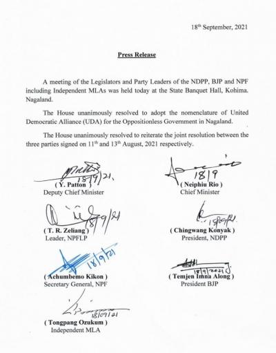 मुख्यमंत्री नेफियू रियो यांच्या नेतृत्वाखाली हे सरकार चालणार आहे. शनिवारी तेथील सर्व पक्षांनी हातमिळवणी केली. तसेच एकत्र काम करण्याचा संकल्प केला. मुख्यमंत्री रियो यांनीच ट्विट करून या आघाडीची माहिती दिली. यामध्ये NDPP, NPF, भाजपा आणि अपक्ष आमदार सहभागी झाले आहेत.