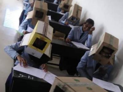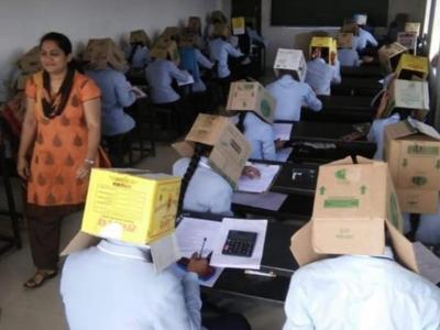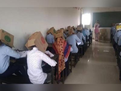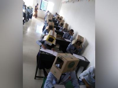 तसेच या कार्डबॉक्सला मुलांना लिहिण्यासाठी दिसावं आणि श्वास घेता यावं एवढं कापण्यात आलं होतं. या कार्डबॉक्समुळे विद्यार्थ्यांना आजूबाजूला बघता येणं शक्य नव्हतं.