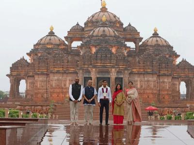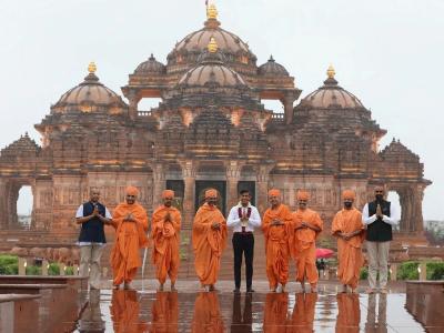 भक्तिभावात तल्लीन झाले सुनक - ब्रिटेनचे पंतप्रधान ऋषी सुनक पत्नीसह सकाळी 6:50 च्या सुमारास अक्षरधाम मंदिरात पोहोचले आणि 7:40 च्या सुमारास मंदिरातून बाहेर पडले. सुनक हे साधारणपणे 50 मिनिटे मंदिर परिसरात होते. या दरम्यान मदिर परिसरात कडेकोट सुरक्षा व्यवस्था होती.