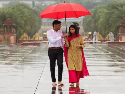 पावसात दर्शन - ऋषी सुनक जेव्हा मंदिरात पोहोचले तेव्हा पावसाची भूरभूरही सुरू होती. यावेळी सुनक आणि त्यांची पत्नी अक्षता मंदिर परिसर हातात छत्री घेऊन दिसले.