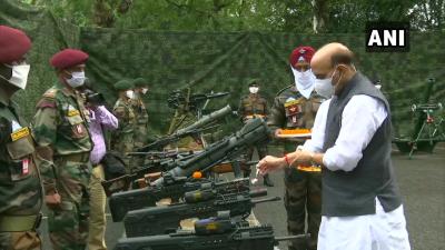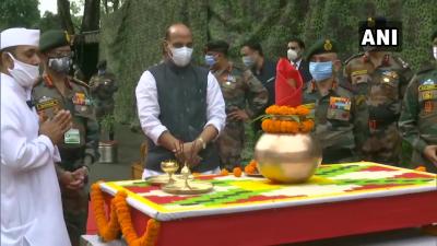 सिंह यांनी शस्त्रपूजा केलेल्या स्थानावरुन नियंत्रण रेषा केवळ 2 किमी अंतरावर आहे, यावेळी लष्करप्रमुख जनरल मुकूंद नरवणे हेही उपस्थित होते