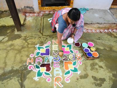 हैदराबादमधील महिला नववर्षानिमित्त घराबाहेर रांगोळी काढताना