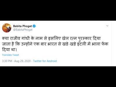 पण, माजी पंतप्रधान राजीव गांधी यांच्या नावे दिल्या जाणाऱ्या पुरस्कारावर भाजपा नेता आणि राष्ट्रकुल पदक विजेती कुस्तीपटू बबिता फोगाट हिनं टीका केली.