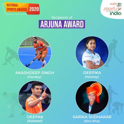 राष्ट्रीय क्रीडा दिनी शनिवारी क्रीडा पुरस्कारांचे वितरण करण्यात आले. क्रिकेटपटू रोहित शर्मा, पॅरा अॅथलेटिक्स मरिअप्पन थंगवेलू, टेबल टेनिसपटू मनिका बत्रा, कुस्तीपटू विनेश फोगाट आणि हॉकीपटू राणी यांना यंदाचा राजीव गांधी खेलरत्न पुरस्कार मिळाला. याशिवाय 27 खेळाडूंना अर्जुन पुरस्कार आणि 13 जणांना द्राणाचार्य पुरस्कारानं गौरविण्यात आलं. कोरोना व्हायरसमुळे हा पुरस्कार सोहळा ऑनलाईन पार पडला. राष्ट्रपती रामनाथ कोविंद यांनी सर्व खेळाडू व प्रशिक्षकांचे अभिनंदन केलं.
