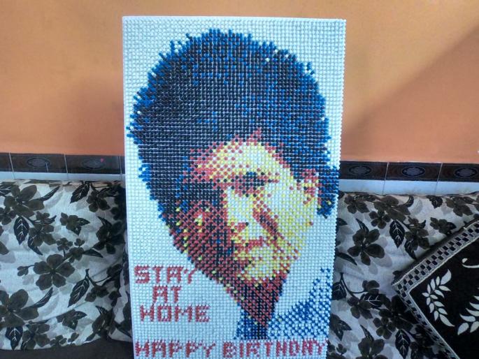 1 / 4नवी मुंबई : क्रिकेटपट्टू सचिन तेंडुलकर यांच्या जन्मदिनानिमित्त कोपर खैरणेतील कलाकाराने पुश पिनांचा वापर करून कलाकृती तयार केली आहे. त्यावर नागरिकांनी घरीच राहण्याचा संदेश देखील दिला आहे. 2 बाय 3 फुटाच्या या कलाकृतीची ५४०० पुश पिनांचा वापर करण्यात आला आहे. 2 / 4कोपर खैरणे येथे राहणाऱ्या आबासाहेब शेवाळे यांनी पाच रंगाच्या पुश पिना वापरून ही कलाकृती तयार केली आहे. क्रिकेट विश्वातील मास्टर ब्लास्टर सचिन तेंडुलकर यांना जन्मदिनाच्या अनोख्या शुभेच्छा देण्यासाठी हा प्रयत्न केला आहे. 3 / 4यासाठी त्यांना दोन दिवसाचा कालावधी लागला आहे. सध्या जगावर कोरोनाच्या संकटाचे सावट आहे. त्यापासून वाचण्यासाठी प्रत्येकाने घरी राहणे हाच उपाय आहे. यामुळे शेवाळे यांनी याकलाकृतीच्या माध्यमातून सचिन तेंडुलकर यांना शुभेच्छा देत नागरिकांना घरी राहण्याचा संदेश दिला आहे. तर कलाकृतीसाठी लाल, निळा, पांढरा, काळा रंगाच्या पुश पिन वापरल्या आहेत. 4 / 4शेवाळे यांच्या नावे अशाच कलाकृतीच्या चार रेकॉर्डची नोंद आहे. त्यामध्ये पणत्या पासून विराट कोहलीचे चित्र, चेस पासून धोनीचे चित्र अशा कलाकृतींचा समावेश आहे. त्यांनी आजपर्यंत पुश पिनांचा वापर करून १०० हुन अधिक कलाकृती तयार केल्या आहेत.