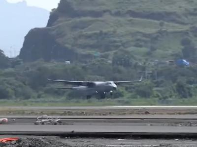 नवी मुंबई आंतरराष्ट्रीय विमानतळावर पहिलं विमान उतरलं. भारतीय हवाई दलाच्या सी २९५ या हे विमान धावपट्टीवर उतरल्यानंतर हवेत घिरट्या मारताना सुखोई-३० विमान..