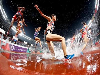 महिलांच्या 3000 मीटर स्टीपलचेस प्रकारात पाण्याच्या अडथळ्यातून वाट काढणाऱ्या धावपटू...