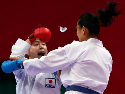 महिलांच्या 68 किलोवरील वजनी गटातील कराटे सामन्यात जपानच्या आयुमी युकूसा आणि चीनच्या गाओ मेंगमेंग यांच्यातील चुरशीचा क्षण...