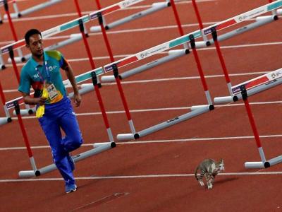 महिलांच्या 100 मीटर अडथळ्याच्या शर्यतीत मांजर आडवी गेली, तिला ट्रॅकवरून पळवण्यासाठी कर्मचाऱ्यांची चाललेली धडपड...