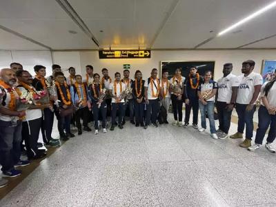 भारताचा तिरंगा इंग्लंडच्या धरतीवर फडकावणाऱ्या भारतीय खेळाडूंची एक झलक पाहण्यासाठी विमानतळावर मोठी गर्दी जमली होती. विमानतळावर खेळाडूंना फुलांचे हार घालून त्यांचे स्वागत करण्यात आले. यावेळी क्रीडा संघटनांचे सदस्यही उपस्थित होते. खेळाडू बाहेर पडताच विमानतळावर टाळ्यांचा कडकडाट झाला.